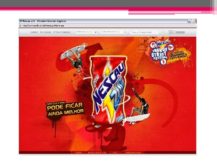 • As empresas podem, por exemplo: • anunciar em seu próprio site, construir sites específicos para produtos específicos. A Nestlé fez com o achocolatado Nescau, os biscoitos Passatempo e o chocolate Surpresa.
