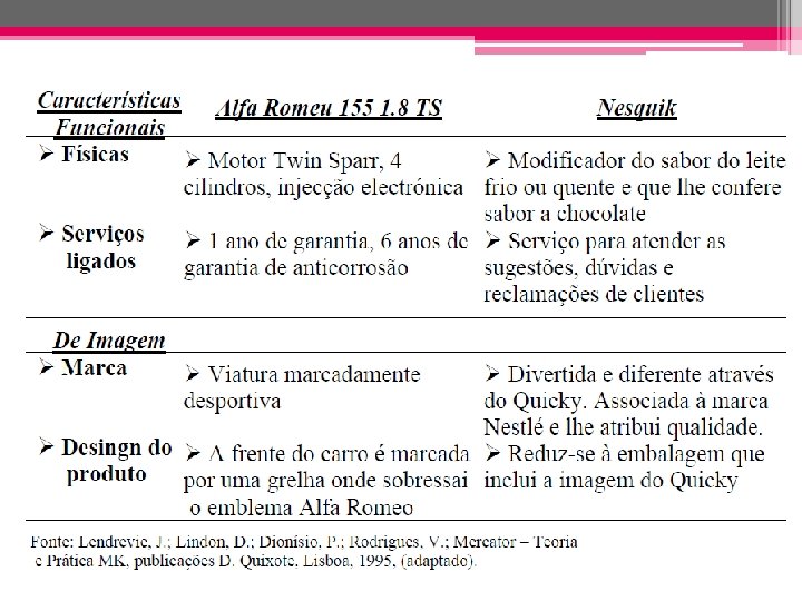 Componentes de um produto Características funcionais Características de imagem • Físicas • Marca • Serviços ligados ao produto • Design