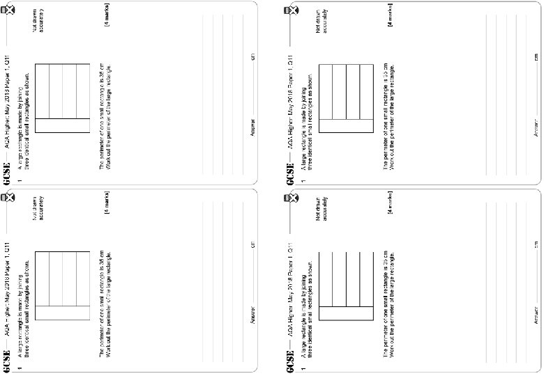 AQA Higher: May 2018 Paper 1, Q 11 1 A large rectangle is made by joining three identical small rectangles as shown. Not drawn accurately The perimeter of one small rectangle is 35 cm Work out the perimeter of the large rectangle. Answer [4 marks] cm