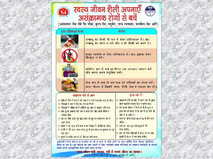 Risk Reduction Organisation of wellness activities Comprehensive IEC pamphlet (IEC) being distributed to all beneficiaries by ASHA during home visits Health cess on alcohol @Rs 1 per bottle Tobacco control activities – School Health activities, constitution of Tobacco Control Committees