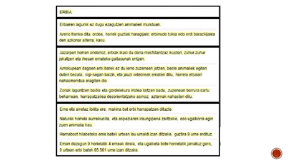 Ezkerrean, aukeratutako esaldiak ditugu. Eskuman, nik testua berridaztean 1. parrafoan egindako aldaketak. Akats gramatikalak zuzendu. Esaldien arteko lotura. 1. Paragrafoko aldaketak: - Zehaztu behar dugu. Parrafoen nork dituen arerio franko, kasu honetan erbiak. arteko lotura. - Ordea lokailua kendu behar dugu, ez dagoelako beste esaldirik berarekin lotzeko. - Puntuazio marka egokiak jarri. markak. Komak kendu ditugu eta amaieran puntua jarri. Puntuazio - Gure hitzak erabili nahi ditugu, horregatik “franko” erabili beharrean bere sinonimoa den “asko” erabili dugu.