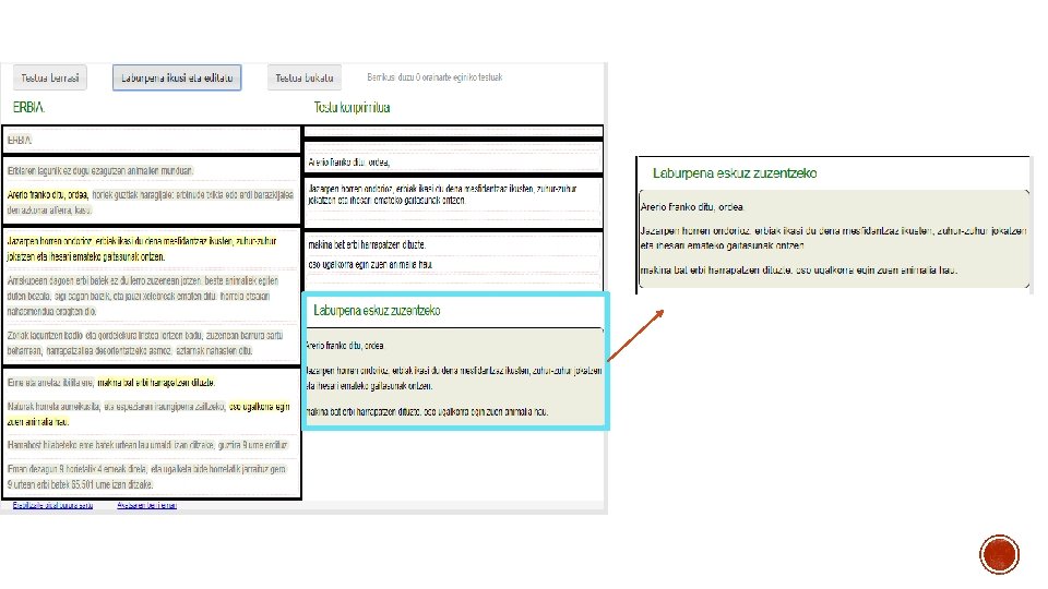 Testua berridatziz egindako laburpeneko 2. parrafoan egindako aldaketak daude eskumako laukian. Akats gramatikalak zuzendu. Esaldien arteko lotura. Parrafoen arteko lotura. 2. Paragrafoko aldaketak: - Bigarren paragrafoa ondo dago, ez dago zertan aldaketarik egin. Egin dugun gauza bakarra markak. izan da gure hitzak erabiltzea, Puntuazio ideia berberak mantenduz.
