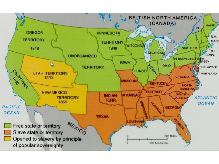 Compromise of 1850 1. 2. 3. 4. 5. California as free state Slave trade abolished in DC; slavery remains legal Texas gets $10 M in exchange for boundary adjustment Utah/New Mexico territories according to “popular sovereignty” Fugitive slave law strengthened