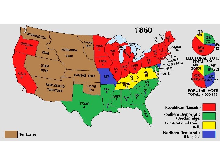 Lincoln “House Divided” speech (1858) We are now far into the fifth year, since a policy was initiated, with the avowed object, and confident promise, of putting an end to slavery agitation. Under the operation of that policy, that agitation has not only, not ceased, but has constantly augmented. In my opinion, it will not cease, until a crisis shall have been reached, and passed. "A house divided against itself cannot stand. “ I believe this government cannot endure, permanently half slave and half free. I do not expect the Union to be dissolved -- I do not expect the house to fall -- but I do expect it will cease to be divided. It will become all one thing or all the other. Either the opponents of slavery, will arrest the further spread of it, and place it where the public mind shall rest in the belief that it is in the course of ultimate extinction; or its advocates will push it forward, till it shall become alike lawful in all the States, old as well as new -- North as well as South.