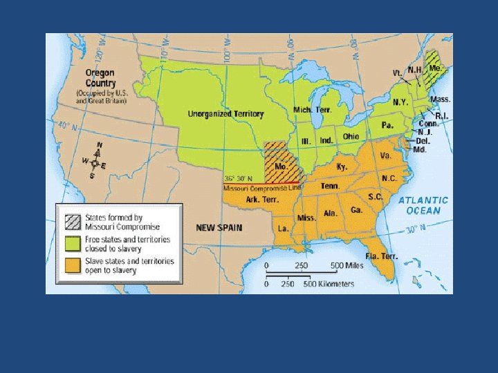 3. The Compromise – Missouri joins as slave state – Maine joins as a free state – Slavery banned in northern part of Louisiana Purchase – Missouri Compromise line 36⁰ 30’ N: everything north of that must be a free states – Keeps the balance for the time being