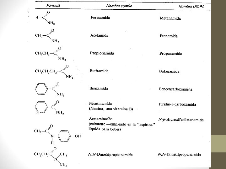 Cuando el nitrógeno de la función amida está unido a: • Dos hidrógenos la amida es primaria • Un hidrógeno y a un radical alquilo (R), la amida es secundaria • Dos radicales alquilo la amida es terciaria PRIMARIA SECUNDARIA TERCIARIA