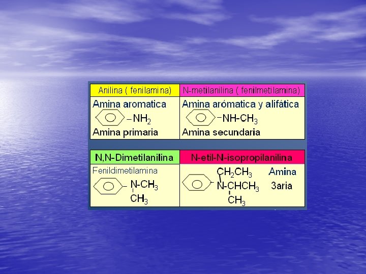 Estructura Nombre R-NH 2 Aminas primarias R-NH-R' Aminas secundarias RNR'R'' Aminas terciarias