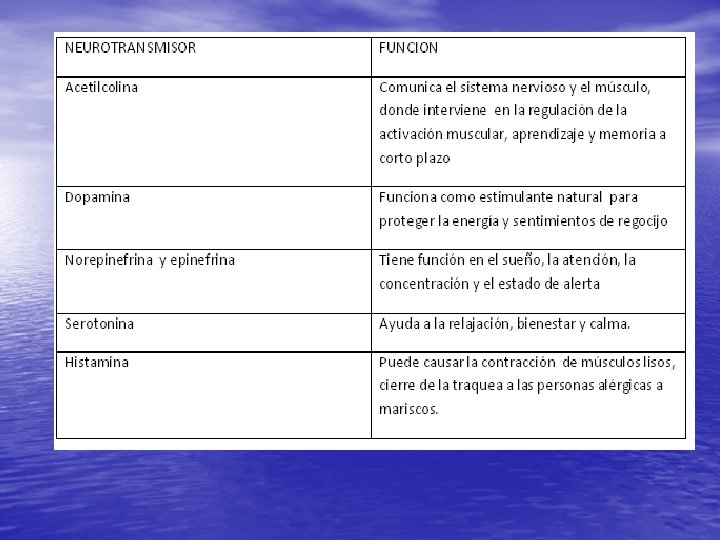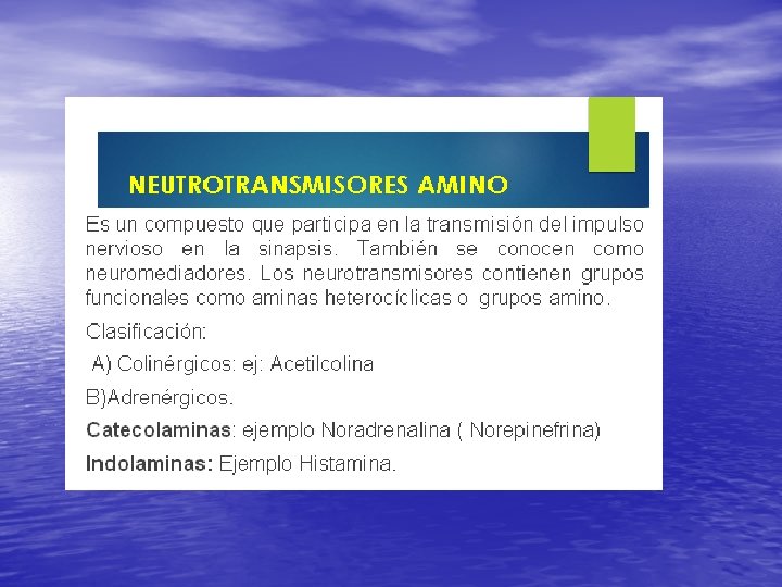NEUROTRANSMISORES: • Es un compuesto químico que transmite un impulso procedente de una célula nerviosa hacia una célula blanco (otra neurona, célula muscular o glandular).