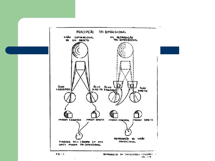 Percepção Tridimensional l l Há 3 categorias de estímulos visuais usadas pelo cérebro para formar uma imagem 3 D: Informações Monoculares – l Informações Visuais Oculo-motoras – l Perspectiva, Conhecimento Prévio do Objeto, Oclusão, Densidade das Texturas, Variação da Reflexão da Luz, Sombras e Sombreamentos. Acomodação e Convergência. Informações Visuais Estereoscópicas
