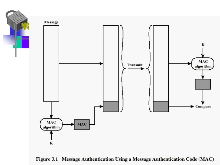 Message Authentication Code • Different from encryption – MAC does not have to be reversible as the cipher text does in encryption – Because of mathematical properties, it is less vulnerable to being broken than encryption • 16 to 32 bit code is typical