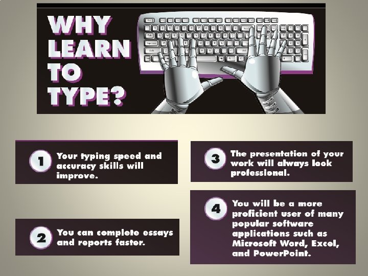 2) Improved hand-eye coordination • Anyone who suffers from poor hand-eye coordination can sympathize with the struggle of playing a game of catch or even writing legibly. • Learning to type can help improve your hand-eye coordination because typing is a continuous action. The lack of pauses while typing makes the activity a powerful way to practice hand-eye coordination.