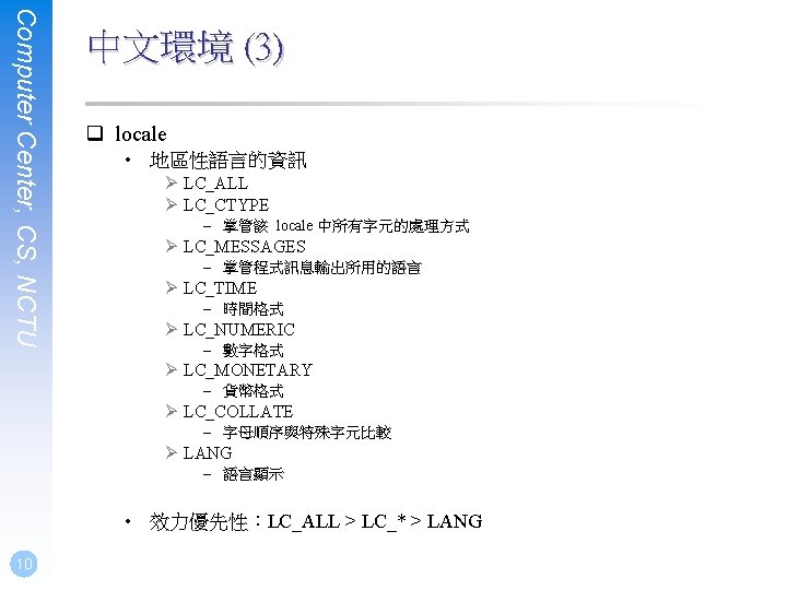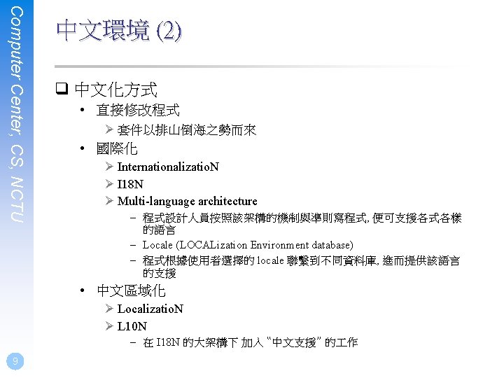 Computer Center, CS, NCTU 31 其他設定 (3) q 設定適合的 Locale(in X window) • en_US. ISO 8859 -1 vs. zh_TW. Big 5(zh_TW. UTF-8) • edit /etc/csh. cshrc (or ~/. cshrc) if ( $MY_TTY == cons || $MY_TTY == ttyv ) then setenv LC_CTYPE zh_TW. Big 5 else setenv LC_CTYPE en_US. ISO 8859 -1 endif