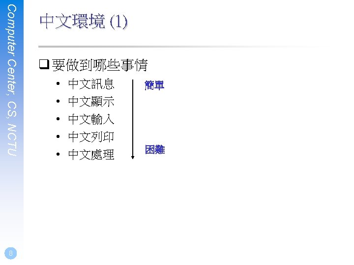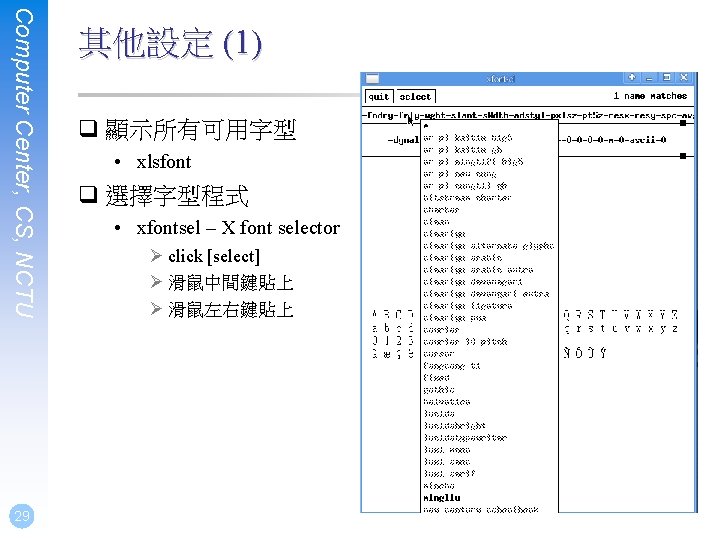 Computer Center, CS, NCTU 20 *安裝中文字型 (7) q 用 xfd 來看 • • % setenv LC_CTYPE zh_TW. Big 5 % xfd –fa “Ming. Li. U”