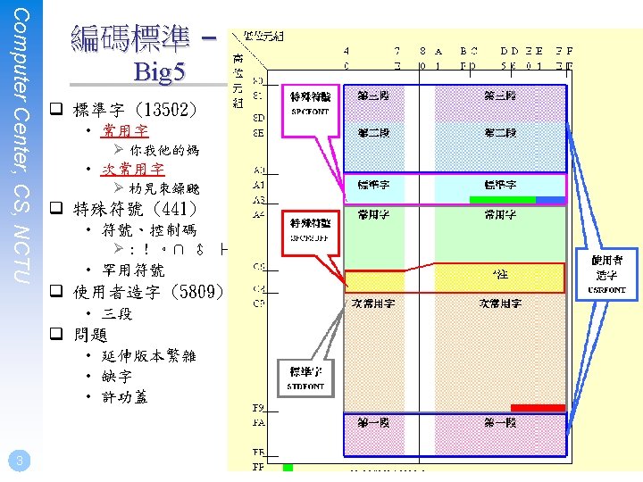 Computer Center, CS, NCTU 編碼標準 Ref: http: //www. cns 11643. gov. tw/web/word. jsp q ASCII • 8 bits (理論上有 256 種可能) • 0 x 00 ~ 0 x 7 F 共 128 種字元 Ø 0 x 00 ~ 0 x 1 F control characters Ø 0 x 20 ~ 0 x 7 F printable characters q Big 5 • 使用 2 bytes 來存放中文字 (理論上有 65536 種可能) • 實際上為與 ASCII 相容, 只能使用 19782 個 Ø [0 x 81 ~ 0 x. FE][0 x 40~0 x 7 E, 0 x. A 1 ~ 0 x. FE] = 126 * (63 + 94) = 126 * 157 = 19782 2