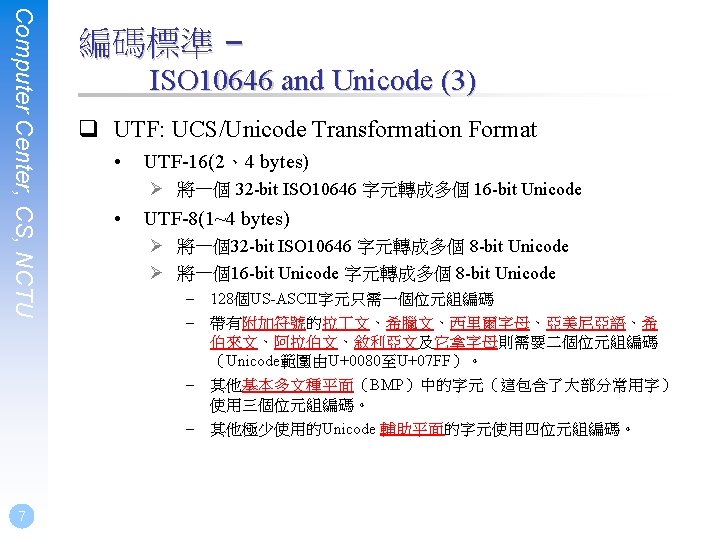 Computer Center, CS, NCTU 6 編碼標準 – ISO 10646 and Unicode (2) q BMP