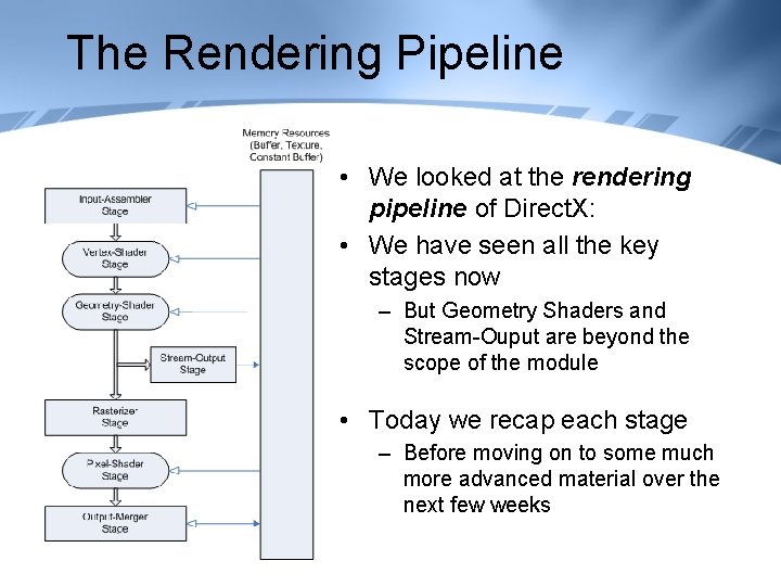 The Rendering Pipeline • We looked at the rendering pipeline of Direct. X: • We have seen all the key stages now – But Geometry Shaders and Stream-Ouput are beyond the scope of the module • Today we recap each stage – Before moving on to some much more advanced material over the next few weeks