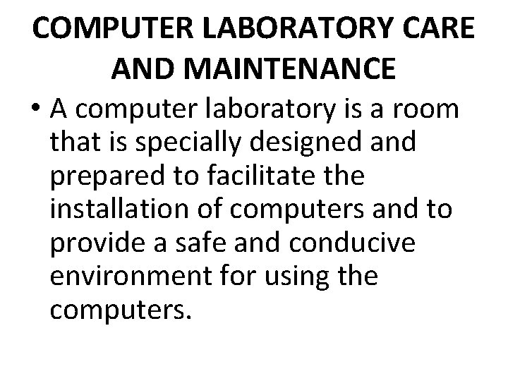 COMPUTER LABORATORY CARE AND MAINTENANCE • A computer laboratory is a room that is specially designed and prepared to facilitate the installation of computers and to provide a safe and conducive environment for using the computers.