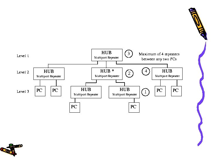 Cascaded Hub Network • Cascading Hubs means to connect the Hubs together through the RJ 45 ports. • One Master Hub (Level 1) is connected to many Level 2 (Slave) Hubs who are masters to Level 3 (slave) Hubs in a hierarchical tree or clustered star. • The maximum number of stations in a Cascaded Hub Network is limited to 128.