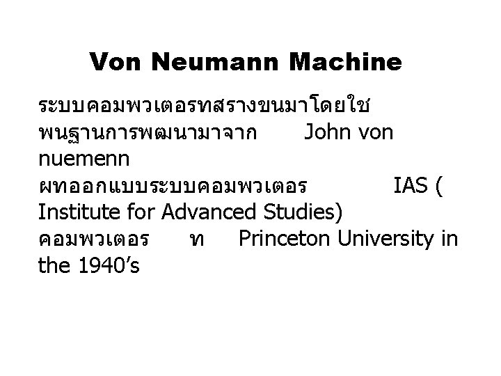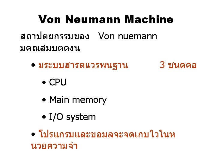 Von Neumann Model z Input Unit Memory Unit Input Unit Arithemtic and Logical Unit (ALU) Control Unit y Provides instructions and data to system Output Unit