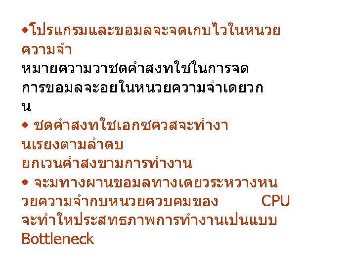 • The instruction set architecture : เปนการแสดงรายละเอยด Software/Hardware ทใชในการเชอมตอทอยในระดบ ภาษาเครองทโปรแกรมเมอรมองเหนได รวมถง • The instruction set • The instruction formats • The available addressing techniques • The format of the available data types