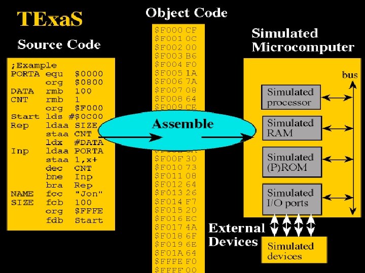 Assembler A computer program which translates from assembly language to an object file or machine language format. An assembler creates object code by translating assembly instruction mnemonics into opcodes, and by resolving symbolic names for memory locations and other entities. The use of symbolic references is a key feature of assemblers, saving tedious calculations and manual address updates after program modifications
