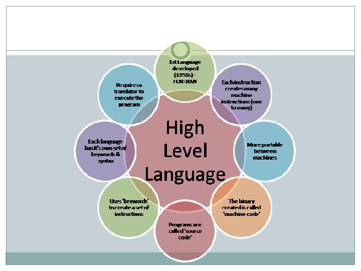 High Level Language User Friendly High level computer languages give formats close to English language Purpose of developing high level languages is to enable people to write programs easily and in their own native language environment (English). High-level languages are basically symbolic languages that use English words and/or mathematical symbols rather than mnemonic codes. Each instruction in the high level language is translated into many machine language instructions thus showing one-to-many translation