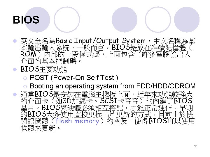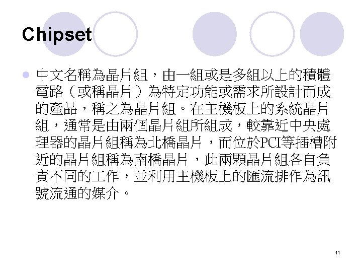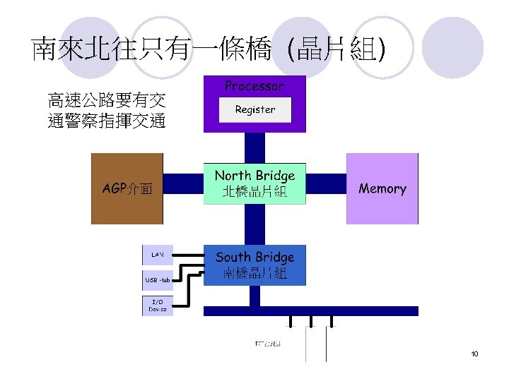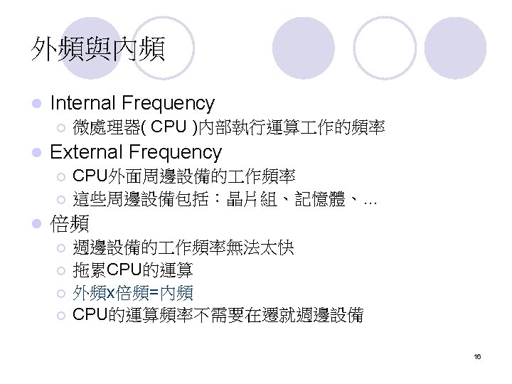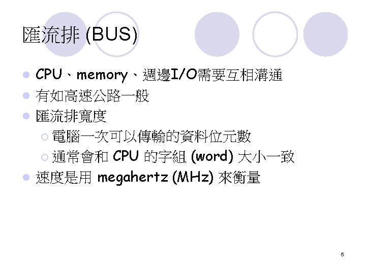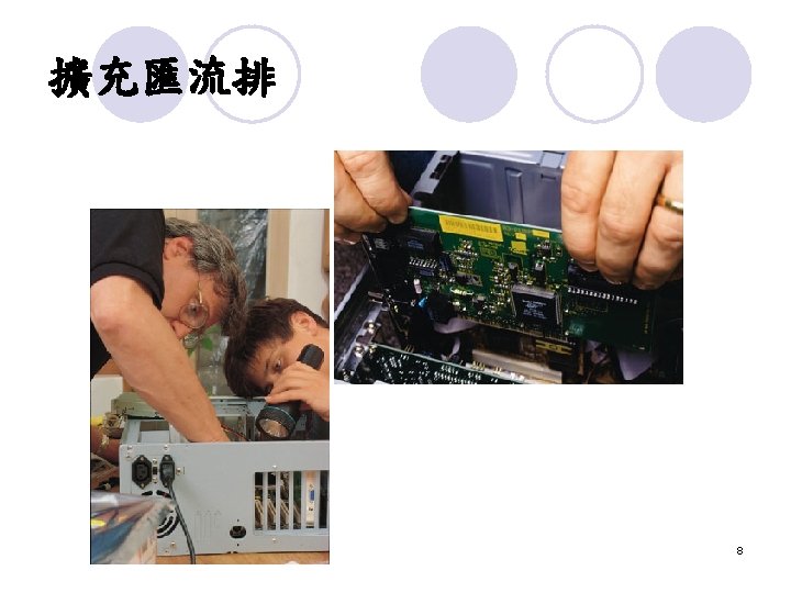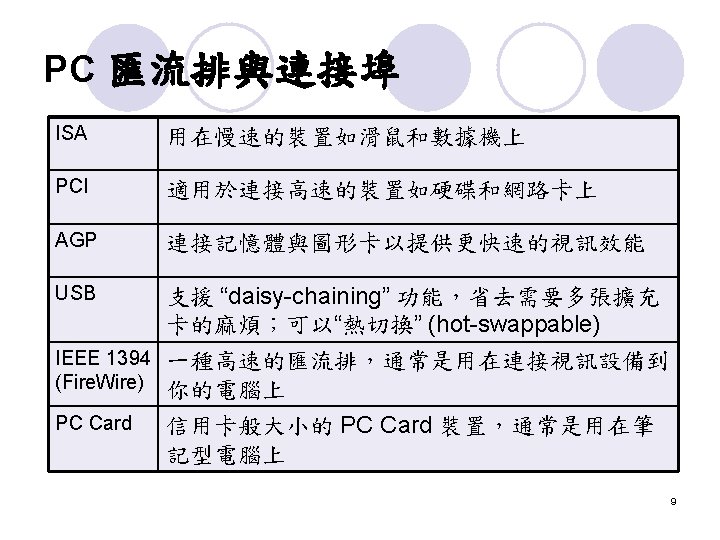 擴充匯流排 (External Bus) The external bus connects the different external devices, peripherals, expansion slots, I/O ports and drive connections to the rest of the computer. l 簡單的說,就是允許各種不同的device與你的電 腦連接 l 7