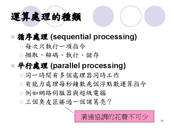 EPIC (Hot and New) Explicitly Parallel Instruction Computing l 增加許多指令平行執行的設計 l 開發指令平行執行的能力 l Intel Itanium (IA 64) l 20