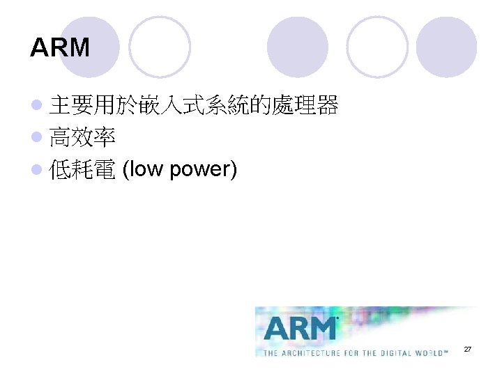 ISA 指令集架構 l ISA (Instruction Set Architecture) ¡ The parts of a processor's design that need to be understood in order to write assembly language, such as the machine language instructions and registers. 18