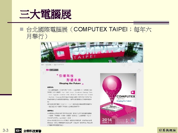 三大電腦展 n 美國拉斯維加斯秋季電腦展(COMDEX FALL;每年 秋季舉行) n COMDEX was a computer expo held in the Las Vegas Valley, each November from 1979 to 2003. n COMDEX VIRTUAL 3 -4 全華科技圖書 計算機概論