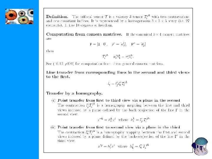 Normalized linear algorithm Objective Given n 7 image point correspondences accros 3 images, or a least 13 lines, or a mixture of point and line corresp. , compute the trifocal tensor. Algorithm (i) Find transformation matrices H, H’, H” to normalize 3 images (ii) Transform points with H and lines with H-1 (iii) Compute trifocal tensor T from At=0 (using SVD) (iv) Denormalize trifocal tensor