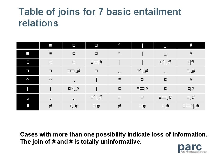 Mac. Cartney’s Natural Logic (Nat. Log) Point of departure: Sanchez Valencia’s elaborations of Van Benthem’s Natural Logic Seven relevant relations: x≡y x⊏y x⊐y x^y x|y x‿y cover x#y equivalence couch ≡ sofa x=y forward entailment crow⊏bird x⊂y reverse entailment Asian⊐Thai x⊃y negation able^unable x⋂y = 0⋀x⋃y=U alternation cat|dog x⋂y = 0⋀x⋃y≠U animal‿non-ape x⋂y ≠ 0⋀x⋃y=U independence hungry#hippo
