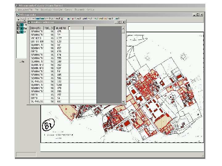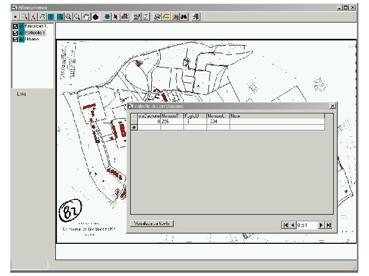 Allineamento catasto terreni – urbano Per una coerente gestione delle banche dati catastali, è indispensabile l’univocità degli identificativi catastali per l’individuazione delle particelle della mappa del catasto terreni e dei corrispondenti elementi della mappa urbana, nonché quella tra i relativi dati degli archivi censuari. E’ inoltre necessario effettuare l’operazione di correlazione tra i fogli del catasto terreni ed i corrispondenti del catasto urbano, laddove esistano porzioni di territorio in cui la geometria è diversa tra catasto terreni ed urbano. Utilizzando il SIT del comune e programmi realizzati appositamente per questo scopo, è stata realizzata la sovrapposizione tra le vecchie mappe cartacee del catasto urbano con quelle numeriche del terreni fornite in formato cxf e convertite in formato topologico shape; da questa sovrapposizione sono emerse, per alcune zone, notevoli difformità di geometrie tra quanto presente nelle due diverse basi. Inoltre, attraverso il collegamento tra la cartografia topologica del catasto terreni ed i dati censuari del terreni e dell’urbano, sono state individuate le incongruenze tra le due diverse basi.