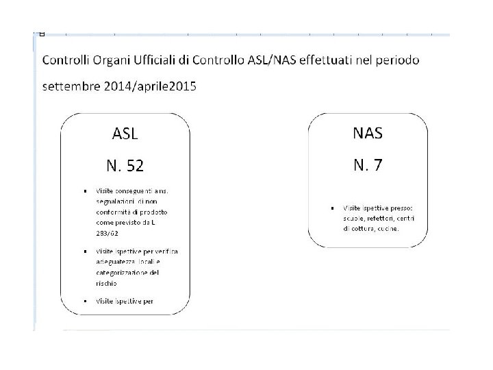 Analisi eseguite da ARPAL nel quadrimestre da Settembre 2014 a Dicembre 2014 TOTALE ANALISI PROGRAMMATE 313 + 10 acqua di rete GRADO ACIDITA’ tot. 1 RICERCA GLUTINE tot. 1 PROVA CESSIONE tot. 1 AFLATOSSINE tot. 1 LATTOBACILLI – LATTOCOCCHI tot. 2 ENTEROBATTERIACEE tot. 3 N 123 visite, a cura dei Tecnici di ARPAL, presso le sedi di ristorazione nel quadrimestre ISPETTIVE tot. 5 RICERCA PESTICIDI tot. 5 POTABILITA’ ACQUA tot. 12 CHIMICA tot. 13 MICROBIOLOGICHE tot. 112 TAMPONI SUPERFICIE tot. 157 Nel corso del quadrimestre sono stati eseguiti ulteriori controlli analitici: campionamenti acqua di rete presso scuole cittadine TOT. 10 1° quadrimestre Anno scolastico 2014/2015