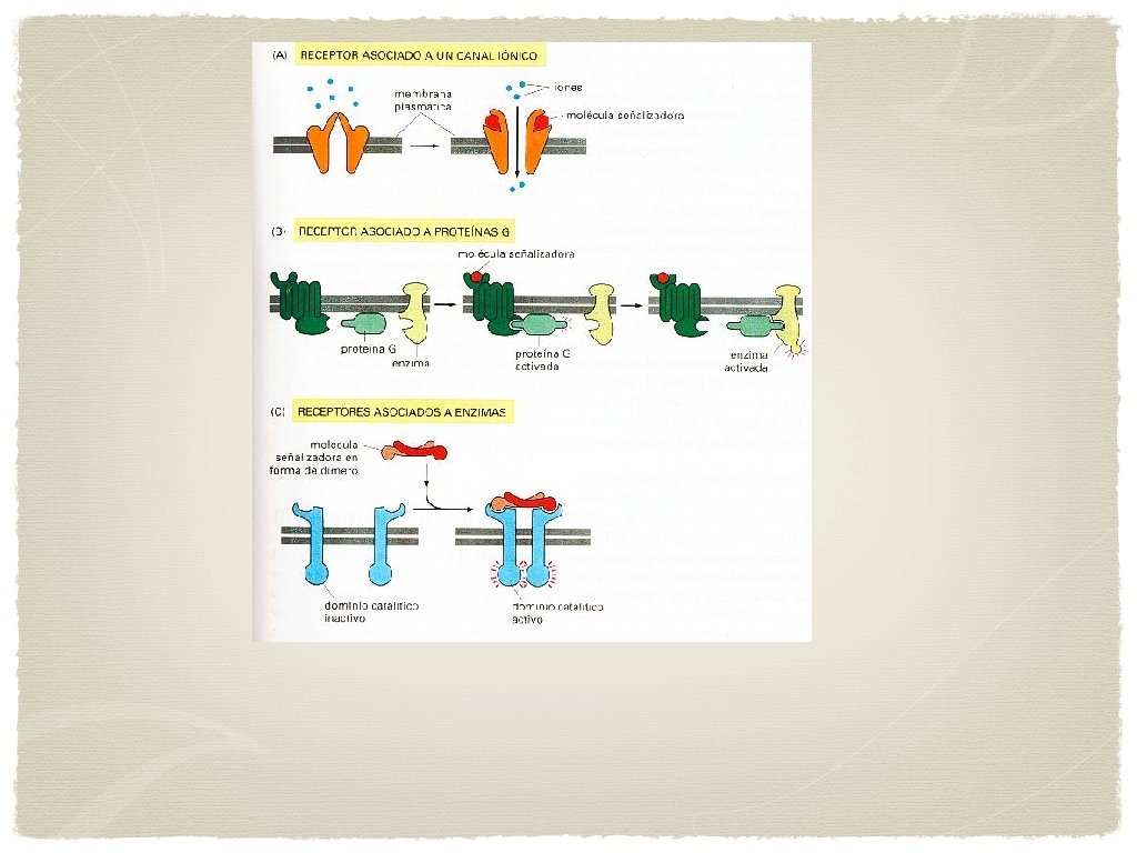 Clasificación de Receptores de la superficie celular Se conocen 3 clases de proteínas receptoras de superficie celular: La familia más numerosa de receptores de superfice Receptores acoplados a celular, transmite las señales al proteína G interior de las células a través de proteínas. Receptores de canales iónicos Mediada por un pequeño número de neurotransmisores que abren o cierran transitoriamente el canal iónico al que están unidos. Asociadas a enzimas Cuando son activadas por su ligando estos receptores actúan como enzimas o están asociados a enzimas. Lugar de unión del ligando en el exterior y el lugar catalítico en el interior.