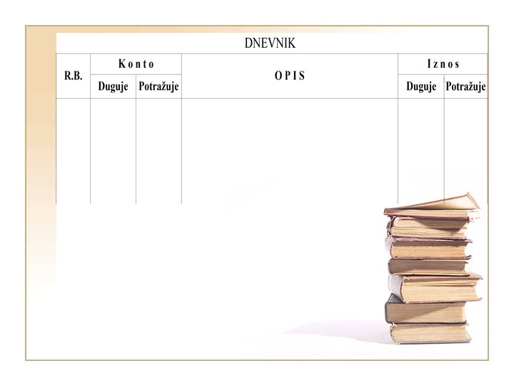 DNEVNIK/GLAVNA KNJIGA SLIČNOST RAZLIKE način evidentiranja hronološka evidencija (dnevnik); sadržina je ista! sistematska evidencija (glavna knjiga) ekonomskim promenama koje su nastale u određenom informacije koje pružaju! vremenskom periodu!(dnevnik) ekonomskim promenama koje su nastale u vezi sa nekom računovodstvenom pozicijom!(glavna knjiga) trenutnom stanju računovodstvene pozicije!(glavna knjiga)