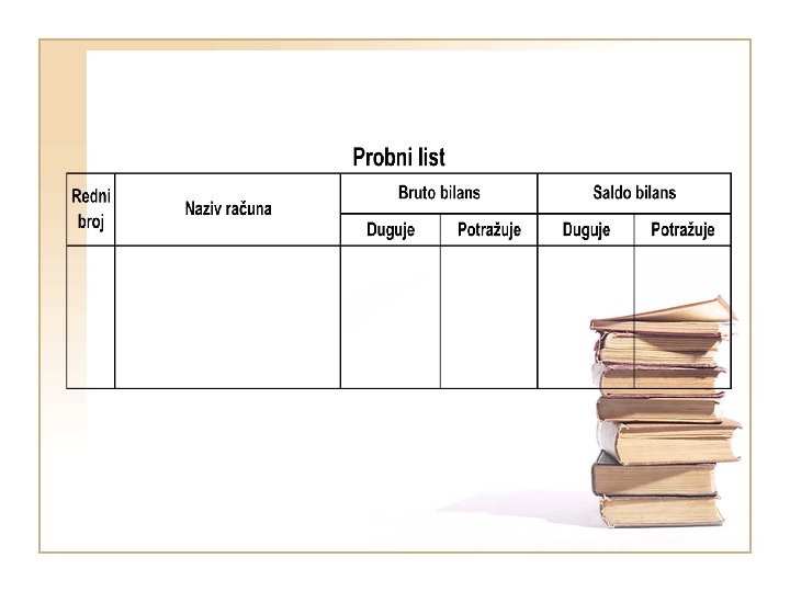 Pomoćne knjige Prometni list je spisak svih analitičkih računa koji pripadaju jednom sintetičkom računu sa pregledom prometa i salda. Svrha probnog lista je kontrola jednakosti prometa dnevnika i zbira prometa svih računa glavne knjige.