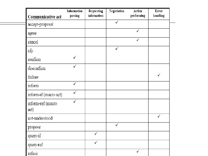 Comunicação direta entre os agentes Ø Os agentes se comunicam para – Pedir uma informação – Enviar uma informação – Pedir a execução de um determinado serviço – …. Ø Os agente tentam alcançar seus objetivos através da comunicação com os outros agentes Ø A maior parte das linguagens para agentes se inspirou na teoria dos atos de fala (speech act)