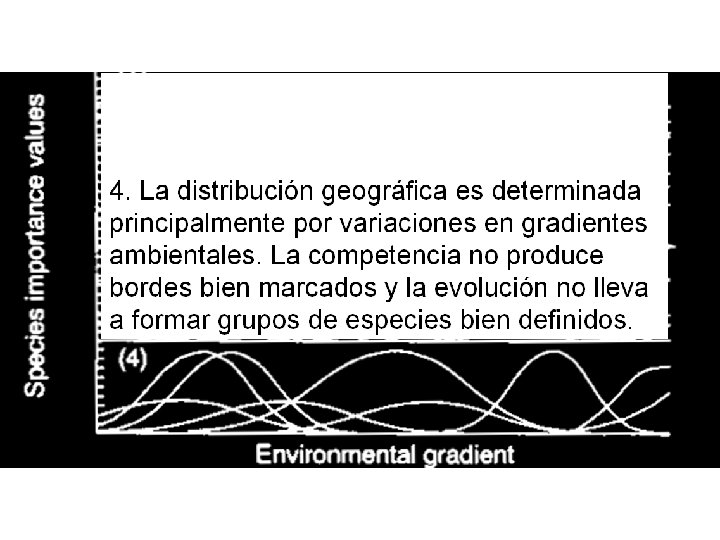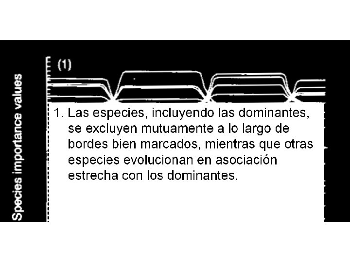 Varias hipótesis sobre las comunidades 1. Las especies, incluyendo las dominantes, 4. La distribución geográfica es determinada se excluyen mutuamente a lo largo de principalmente por variaciones en gradientes bordes bien marcados, mientras que otras ambientales. La competencia no produce 2. La competencia entre especies no resulta especies evolucionan en asociación bordes bien marcados y la evolución no lleva enestrecha la distribución de poblaciones a lo largo de con los dominantes. a formarbien grupos de especies bien definidos. bordes marcados. 3. Las especies que compiten se excluyen mutuamente pero no forman grupos con distribuciones paralelas.