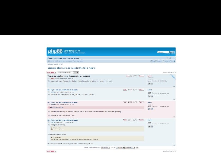 Tipos de Comunidades Virtuales � � Tableros de Mensajes de Internet Es un foro donde la gente puede discutir pensamientos o ideas en varios temas. Los centros de mensajes en línea permiten a los usuarios escoger qué hilo, o tablero de discusión, los usuarios quieren leer o contribuir. Un usuario iniciará una discusión haciendo una publicación en un hilo. Otros usuarios que escojan responder pueden seguir la discusión añadiendo su propia publicación al hilo. Los tableros de mensajes no son basados en la conversación porque las respuestas de los usuarios no necesitan ponerse inmediatamente. Cada vez que el usuario revisita el tablero, puede hacer una respuesta. Al contrario de una conversación los tableros de mensajes no tienen respuestas instantáneas y requieren que el usuario activamente vayan al sitio a revisar las respuestas.