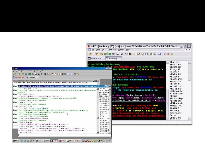 � Salas de Chat en línea � Después del aumento del interés en los tableros de mensajes y foros, la gente empezó a querer una manera de comunicarse con sus “comunidades” en tiempo real. La desventaja de los tableros de mensajes es que la gente tenía que esperar hasta que otro usuario publicara una respuesta a su publicación, lo cual, con gente alrededor del mundo en diferentes husos horarios podía tomar un tiempo. El desarrollo de salas de chat en línea permitió a la gente hablar con otros en línea y en el mismo momento. De este modo los mensajes eran enviados y los usuarios podían responder inmediatamente.