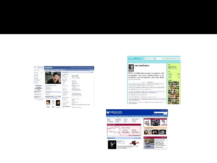 � Servicios de Redes Sociales Son el más prominente tipo de comunidad virtual. Son bien un sitio o una plataforma de software que se enfoca en crear y mantener relaciones. Facebook, Twitter, y Myspace son todas comunidades virtuales. Con estos sitios, uno crea un perfil o cuenta, y agrega amigos o sigue amigos. Esto permite a la gente conectarse y buscar apoyo usando el servicio de red social como un lugar de reunión. Estos sitios frecuentemente permiten a la gente mantenerse al día con las actividades de sus amigos o conocidos sin hacer mucho esfuerzo. En Facebook por ejemplo, uno puede subir fotos y videos, chatear, hacer amigos, reconectar con viejos conocidos y unirse a grupos y causas. Todas estas funciones alientan a la gente a formar una comunidad, pequeña o grande, en la Internet.