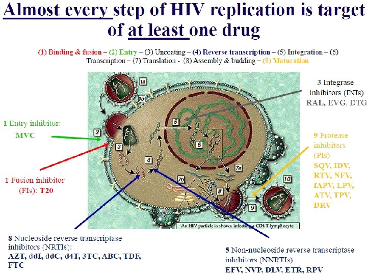 Introducción • En Chile al año 2013 hay más de 20 ARV para tratar la infección por VIH, de las cuales Estavudina (d 4 T), Indinavir (IDV) y Nelfinavir (NFV) ya no están recomendadas en esta guía. • Los ARV se clasifican de acuerdo al mecanismo de acción, mediante el cual suprimen la replicación viral.
