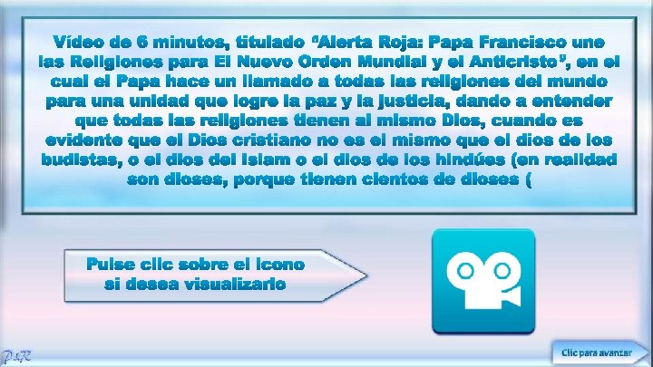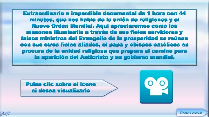Queridos amigos: Algún día veréis que todas nuestras publicaciones “molestas” eran sólo porque nos importaba vuestra salvación… Vuestra alma es lo más importante que tenéis… Y hemos preferido ser rechazados por hablaros de la verdad, que guardar silencio para ganar vuestra aceptación. Hace tiempo alguien se preocupó por nosotros compartiendo el evangelio de Jesucristo y nos abrió los ojos a la verdad. Ahora es nuestra responsabilidad hacer lo mismo por vosotros… Os amamos a todos en el amor de Jesús. Firmado: A continuación les proporcionamos algunos vídeos muy reveladores que reforzarán todo lo que aquí se ha tratado.