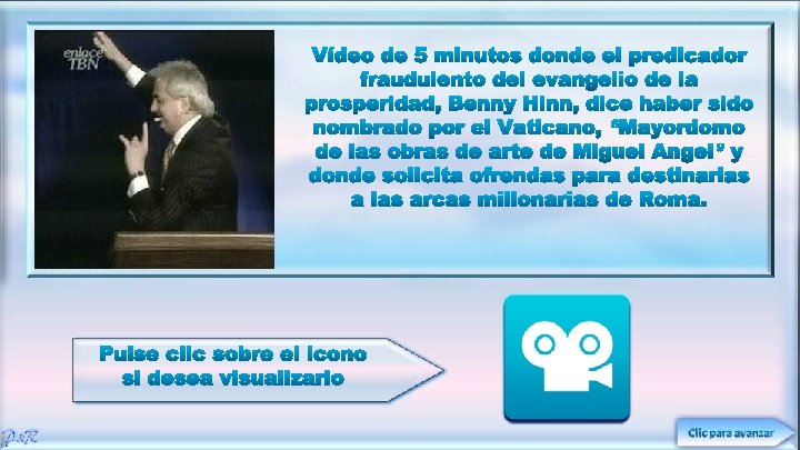 Al final, de nuestra presentación mostraremos un vídeo donde el predicador Benny Hinn, dice que fue nombrado “mayordomo de las obras de Miguel Ángel” y que estaba solicitando ofrendas a sus fieles y terceras personas para llevar jugosas sumas de dinero a las arcas millonarias del Vaticano.