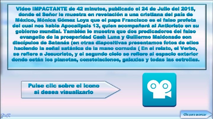 MENSAJES CRISTIANOS PUBLICADOS EN “MIS PPS”, POR PALOMA & ROBY Si desean visualizar las siguientes presentaciones deberán pulsar clic sobre el título deseado para enlazar con la sección donde se encuentra ubicado en MIS PPS y así procedan a ¿Es Halloween Un Inocente descargarlo. ¡Reconoce Ud. los Tiempos Juego de Niños? que Estamos Viviendo? Ex Satanista Habla Acerca de Halloween El Sacrificio de Jesucristo Según el Antiguo Testamento Cómo Reconocer a una Secta La Cara Oculta de Halloween De Científico a Siervo de Dios Niño Regresa del Cielo con un Mensaje para el Mundo Un Vistazo a la Eternidad Conoce lo que Dios Aborrece El Evangelio de la Prosperidad Clic para la siguiente diapositiva