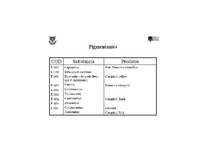 CLASSIFICAÇÃO DOS ADITIVOS Legislação Comunitária A- Antibióticos B- Substâncias de efeito antioxidante C- Aromatizantes e apetentes D – Coccidiostáticos e outras substâncias de efeito específico E- Emulsionantes, estabilizantes, espessantes e gelificantes F – Corantes, incluindo pigmentos G- Agentes conservantes H – Vitaminas, provitaminas e substâncias de efeito análogo, quimicamente bem definidas I – Oligoelementos J- Factores de crescimento L- aglomerantes, antiespumantes e coagulantes M – Reguladores de acidez