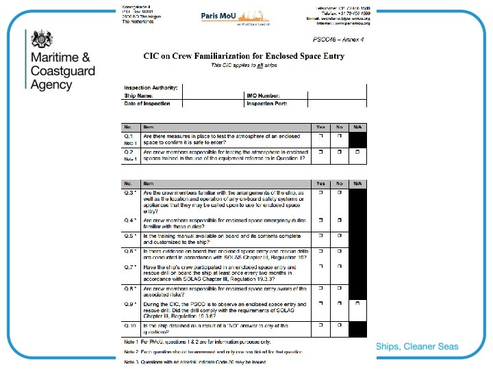 Q 8. Are crew members responsible for enclosed space entry aware of the associated risks? Q 9. During the CIC, the PSCO is to observe an enclosed space entry and rescue drill. Did the drill comply with the requirements of SOLAS Chapter III, Regulation 19. 3. 6? Q 10. Is the ship detained as a result of a “NO” answer to any of the questions?