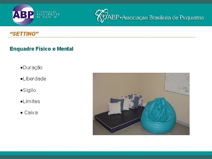 CARACTERÍSTICAS DO “SETTING” ----------------------------------------------------------------------------------------------------------- • Rapidez e dinamismo • Processo constante • Disponibilidade do analista • Modulação da ansiedade • Mínimo de interferência • Comunicação