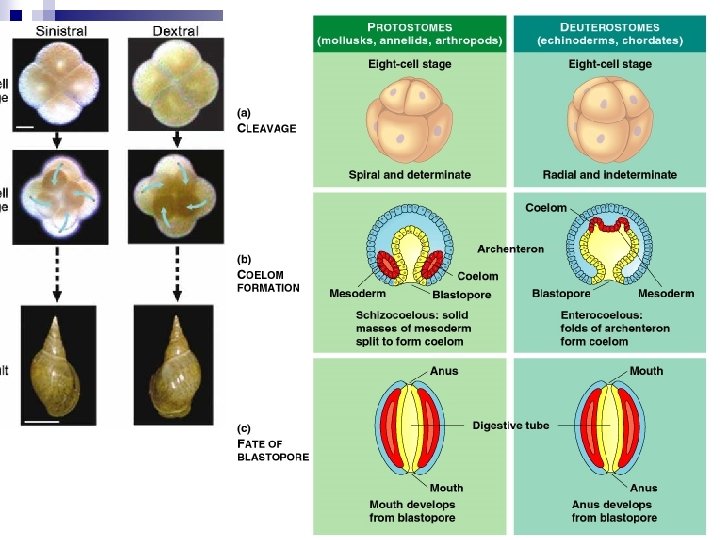 Protostome vs Deuterostome Cleavage Coelom formation Blastopore formation Phyla Protostomes Deuterostomes spiral Radial
